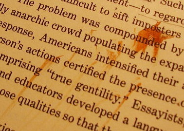 | 夜、本を読んでいたら蚊が本に止まった。すかさず手で叩き付けた。ところがその瞬間蚊の体内に蓄積されていた(?)血がどばっと本に広がった。慌ててティッシュペーパーで拭き取ったのだが、せっかくの本が無惨な姿になってしまった(→写真)。ちなみにこの本は非常にかわいそうなヤツで、昼間に食べていた焼そばの皿の上に落ちたこともあり、その底は焼そばソースで彩られている。そもそも勉強机で食べ物を食べること自体が間違っていると言わざるを得ないのだが、食べ物用のテーブルは、その一面がCDに占拠されてしまっているのだ。そろそろ対策を考えねばならないな。箱を買って、いらなさそうなものは日本に送るしかないようだ。 | ![]() |